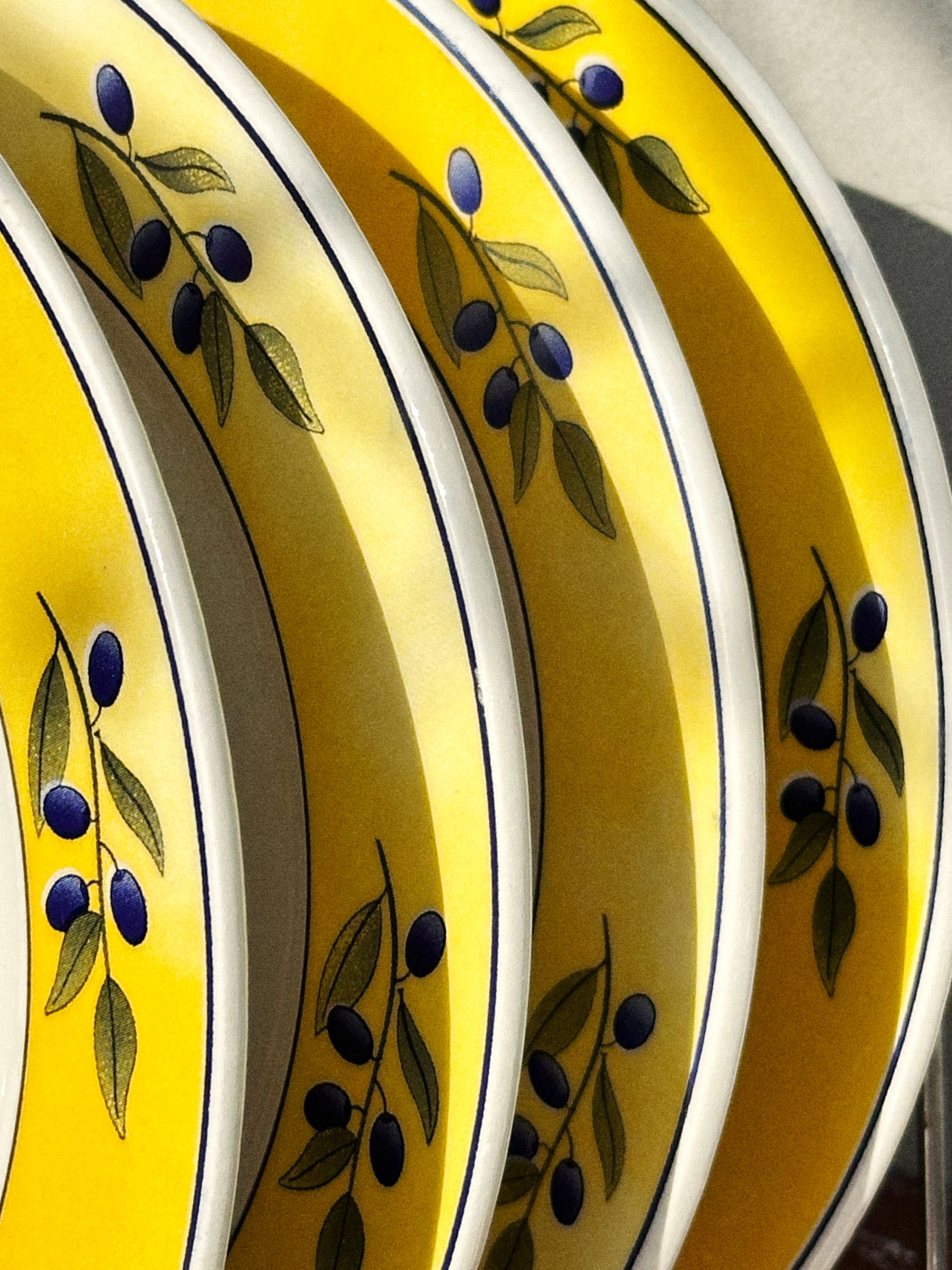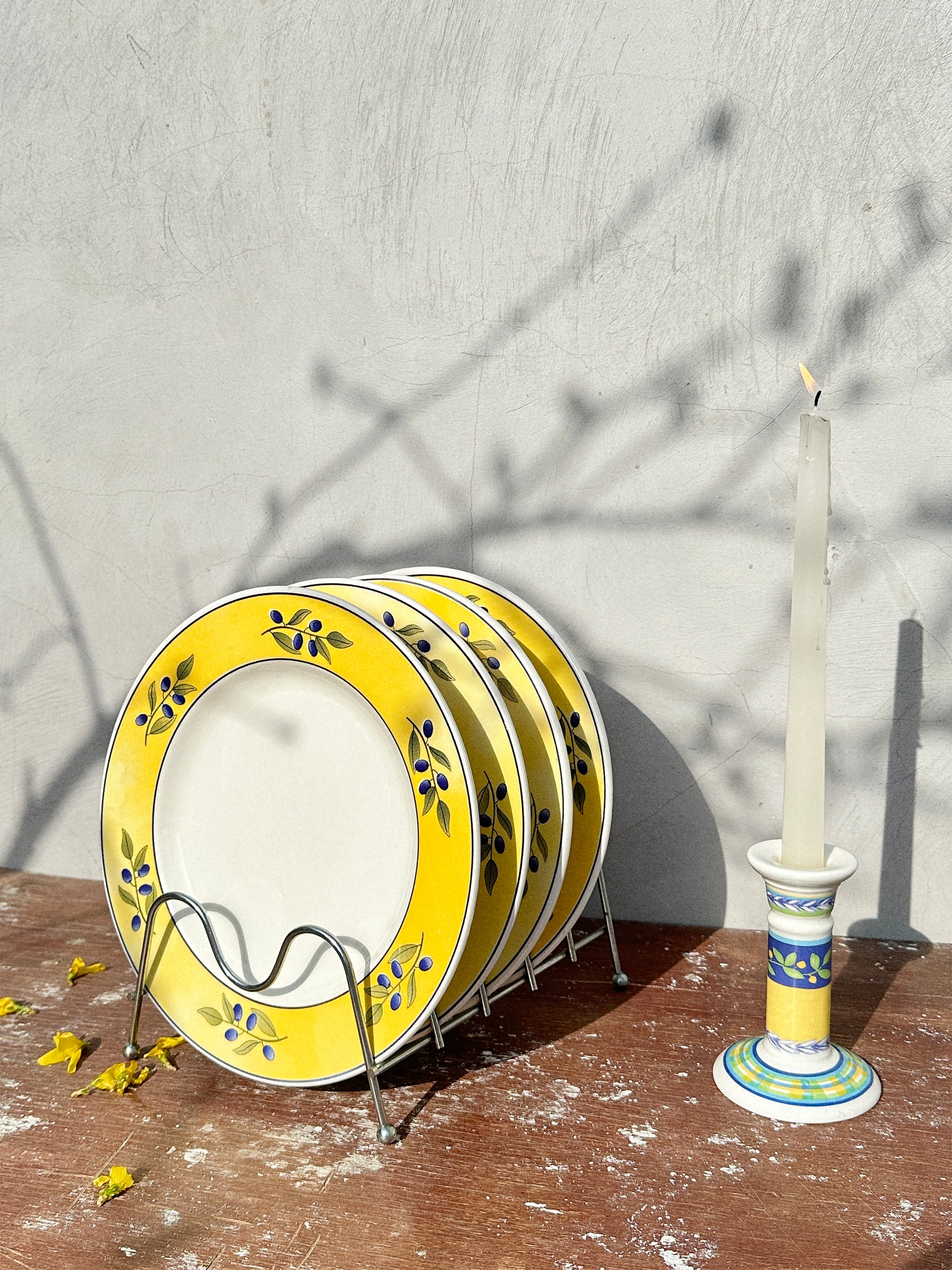 The set of 4 large plates were produced in Italy by Ceraminter sometimes during 1980s and they look like something any Italian nonna would pull out of their kitchen cabinet, alongside with that candlestick holder produced in Portugal by Vista Alegre as part of the Camonila Collection, also during 1980s, the sort of piece she got as a souvenir whilst holidaying [though if you`d lived in 1980s Italy, with all that beauty around, cannot possibly find any reasons to travel, so maybe it was a gift from one of her children].
