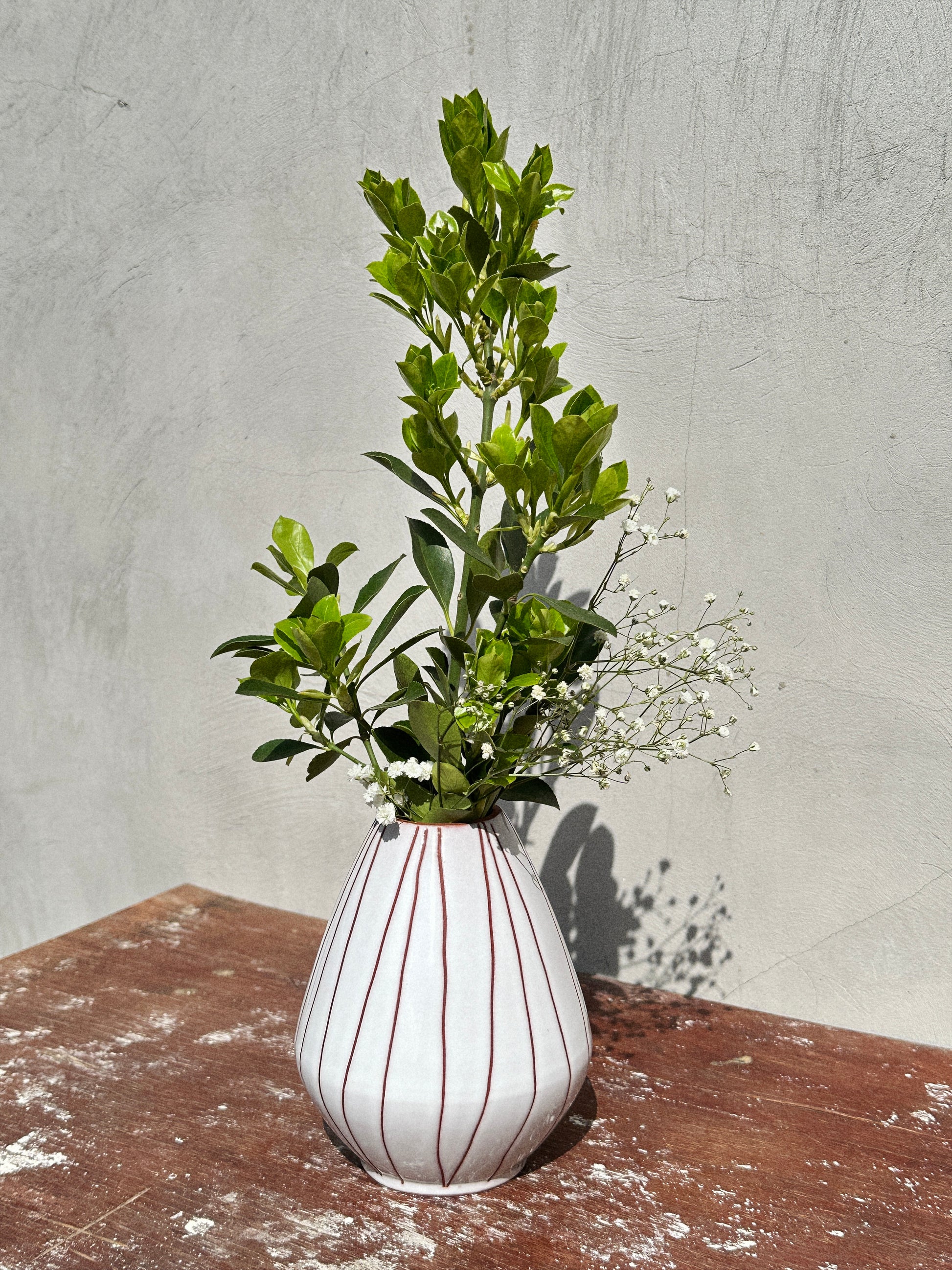 Introduced during early 1950s, form 832 has come in many colours and glazes, but nothing as minimalistic and as wonderfully crafted as this limited edition vase. Each of the fine lines are handmade, irregularly carved into the terracotta base, creating an almost Op Art effect.