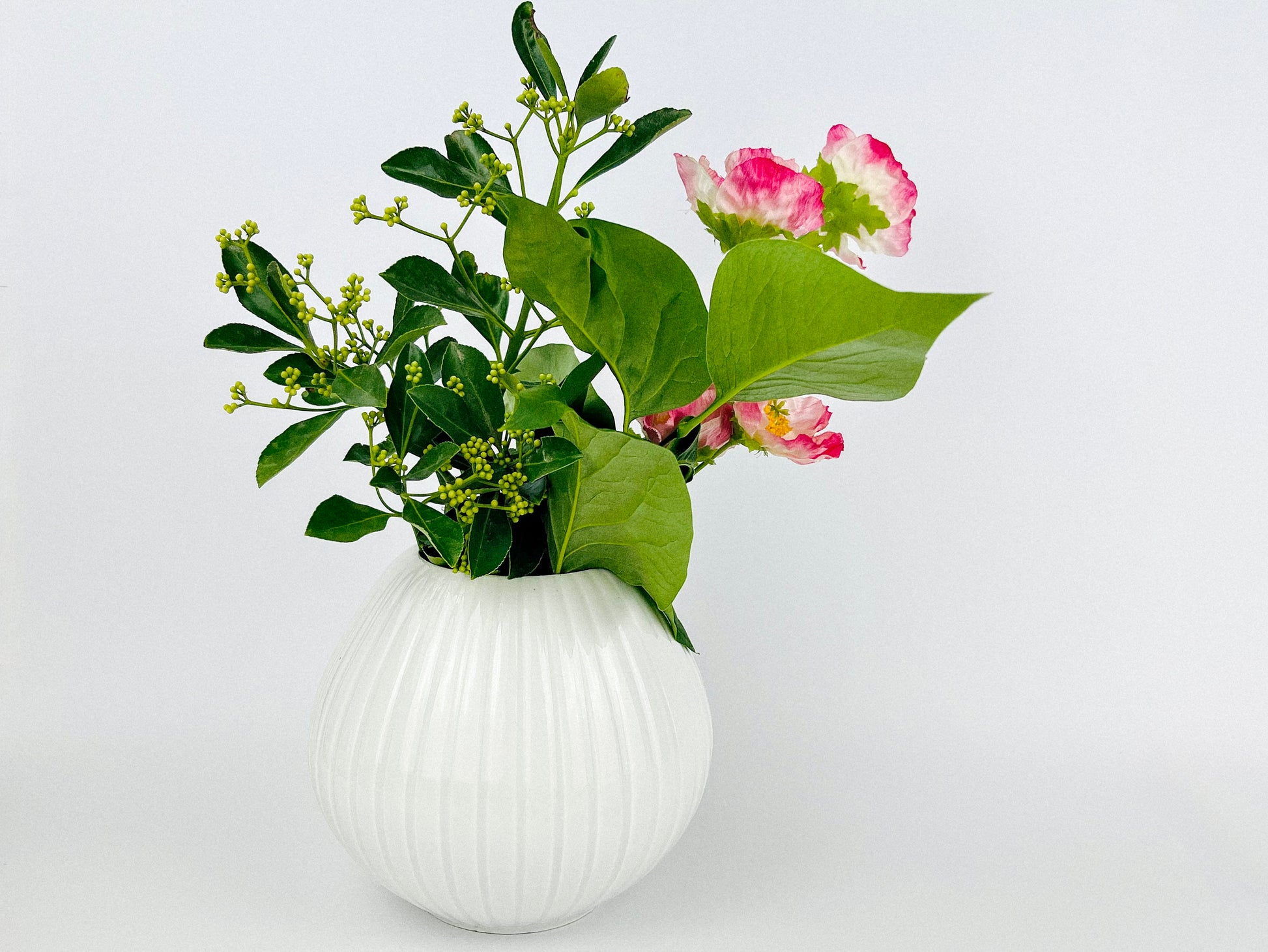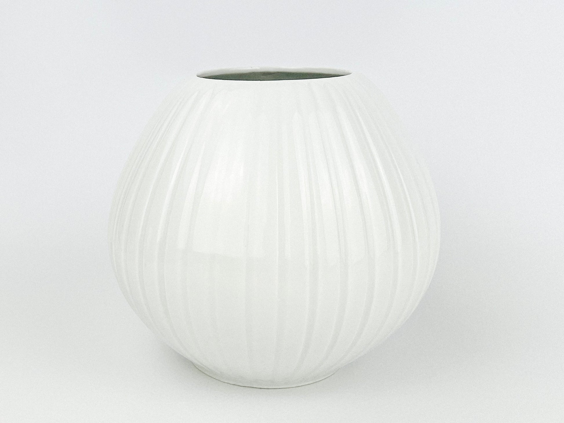 With a minimalist line relief pattern and a slightly spherical shape, this is a classic piece that truly embodies the mid-century style, a wonderful addition to any modern home. The vase is in mint condition, glazed inside and out for an easy clean.