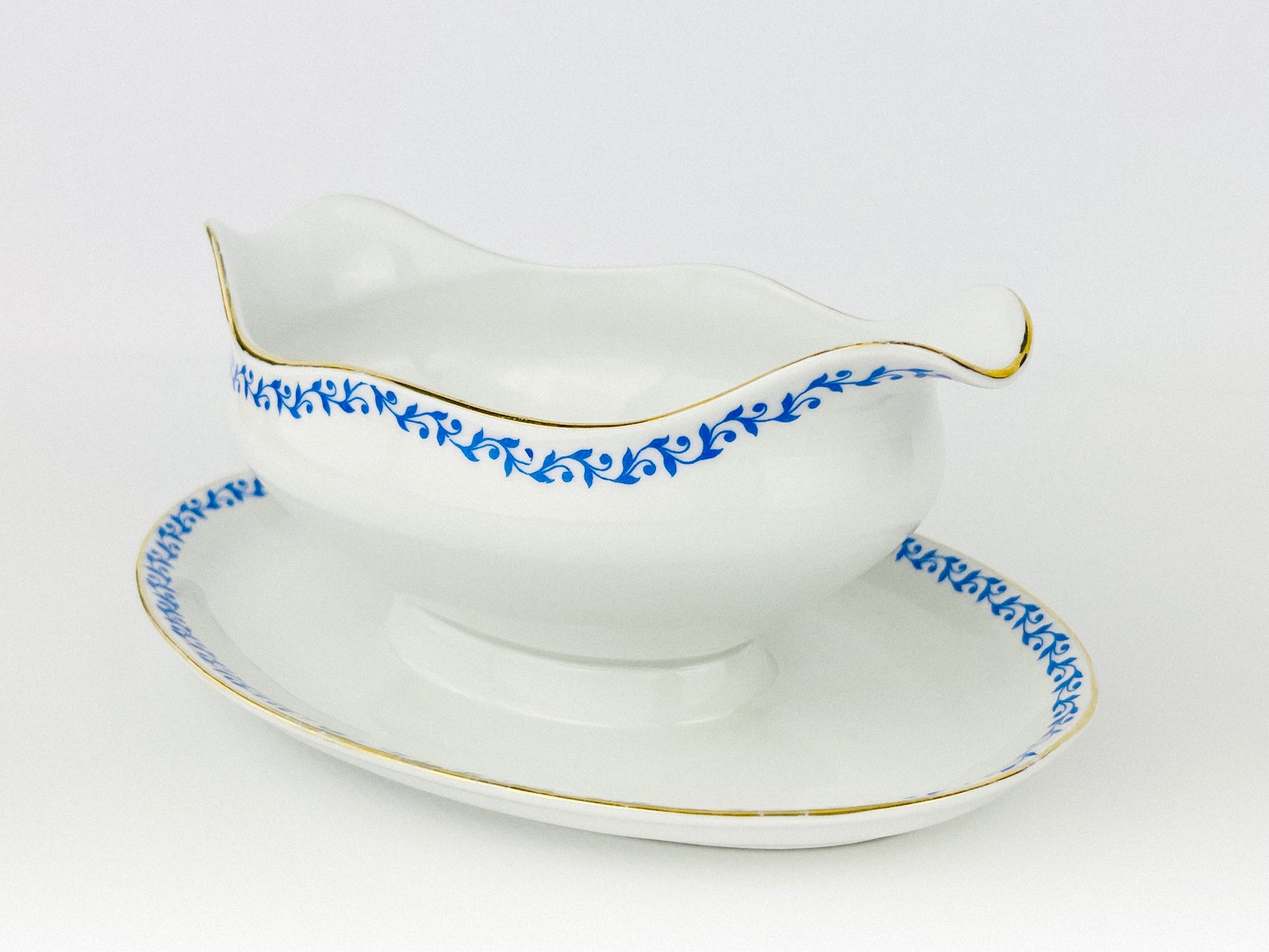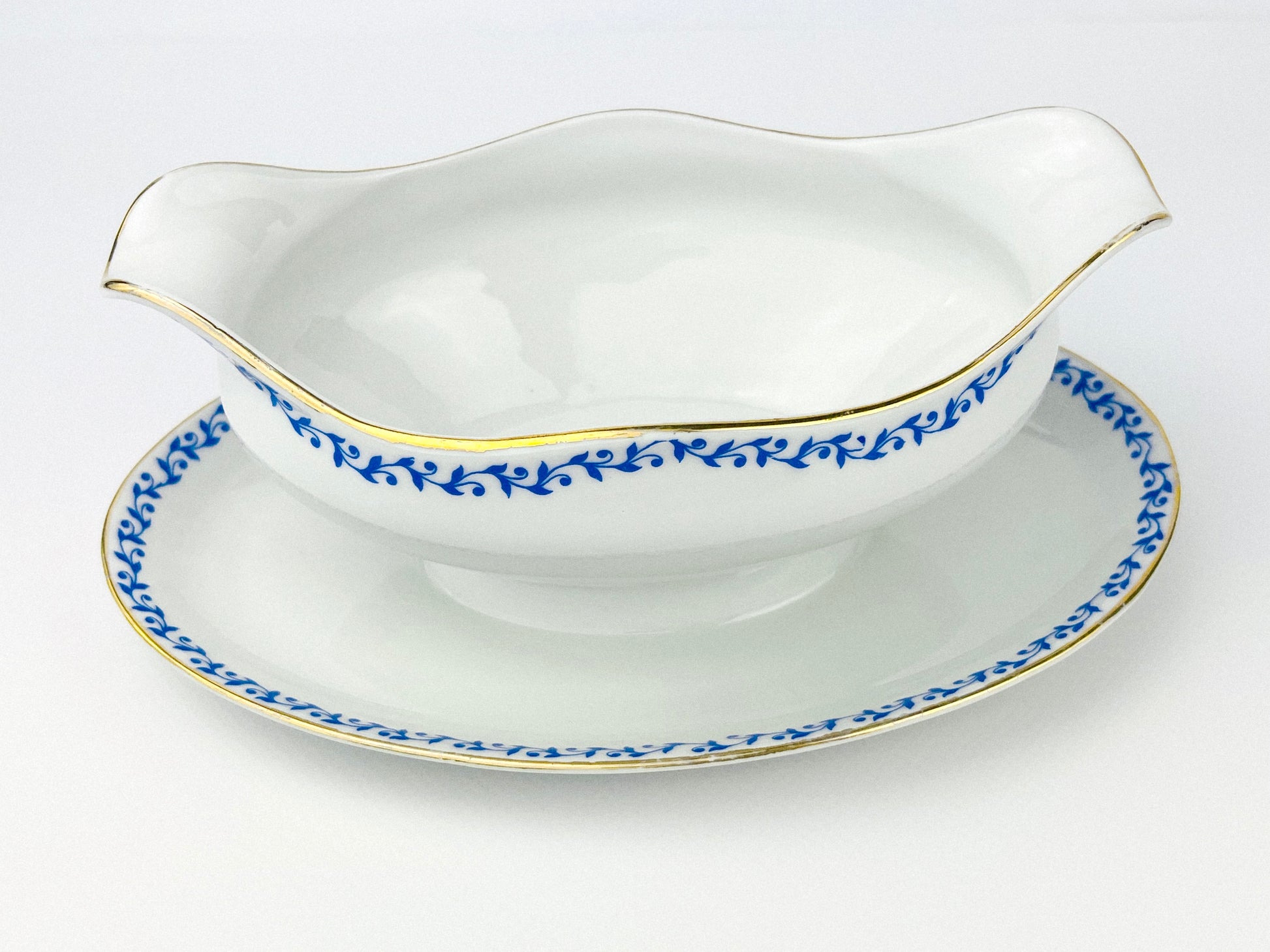 Porcelain gravy/sauce boat with attached underplate produced in France during 1960s, with an intense blue leafy/laurel pattern and a colloidal gold rim on both the bowl and underplate. This is actually a piece we have found at a French antique dealer in Italy, inspired from the Liberty and Atlas China patterns from the late 1800s, early 1900s.