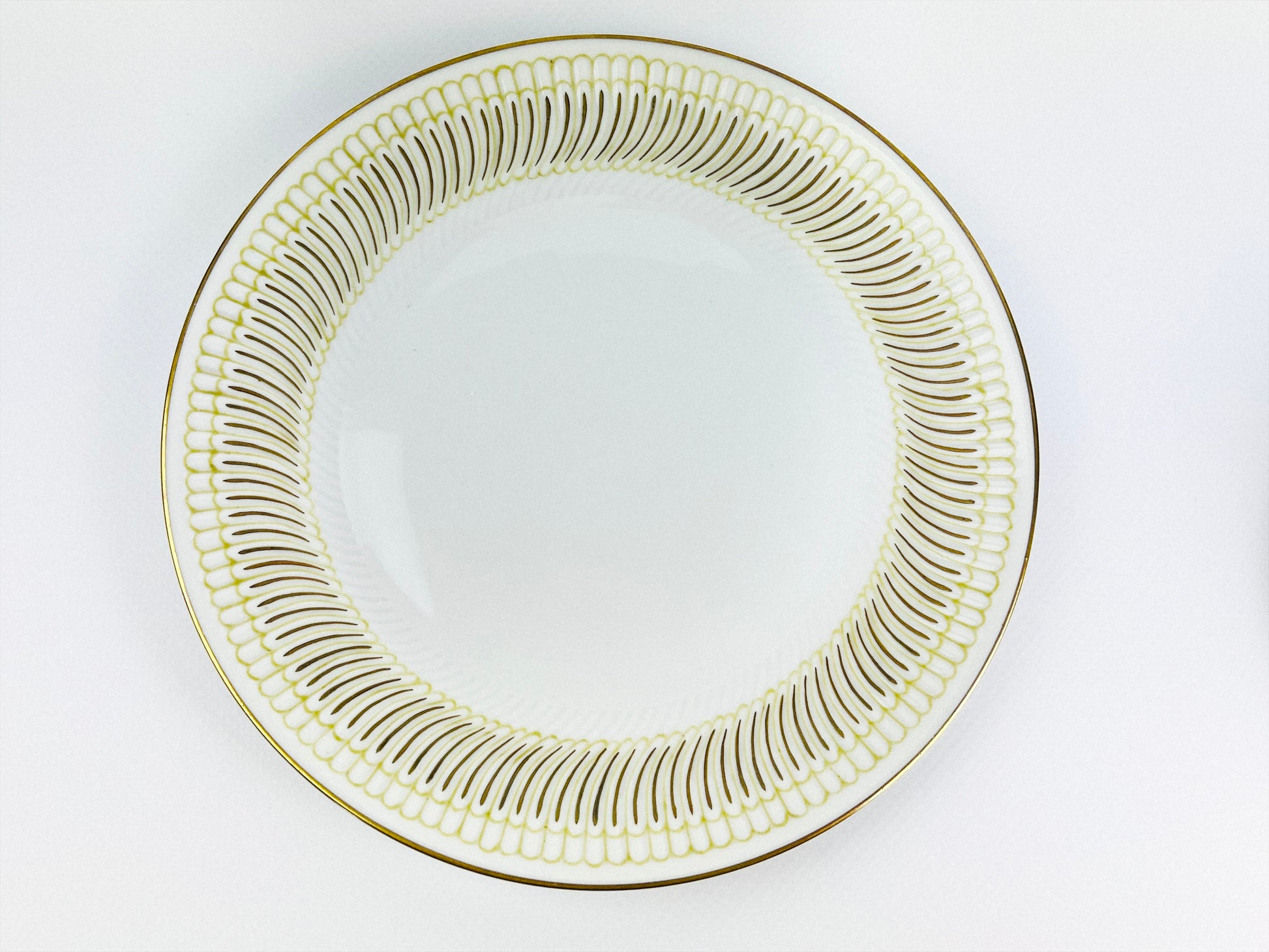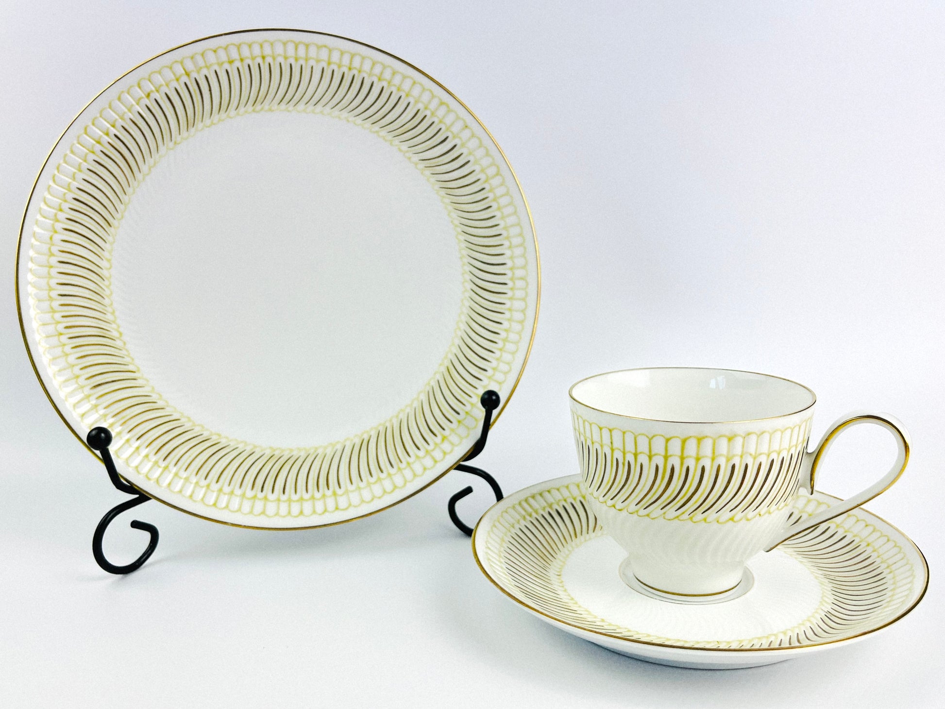 Rare porcelain trio produced by Edelstein Bavaria during early 1930s, most likely before the start of WWII, decorated with a lovely hand painted Art Deco rounded line pattern, an embossed design, in the same fashion, and a colloidal gold rim. What makes this set stand out is the perky use of ochre-yellow, resembling the peach/pear tones from Caravaggio’s “Boy with a Basket of Fruit” (1593), one of his very first works. That very colour was very much in vogue during 1930s and had a massive revival during 1960s, alongside orange, green and gold.