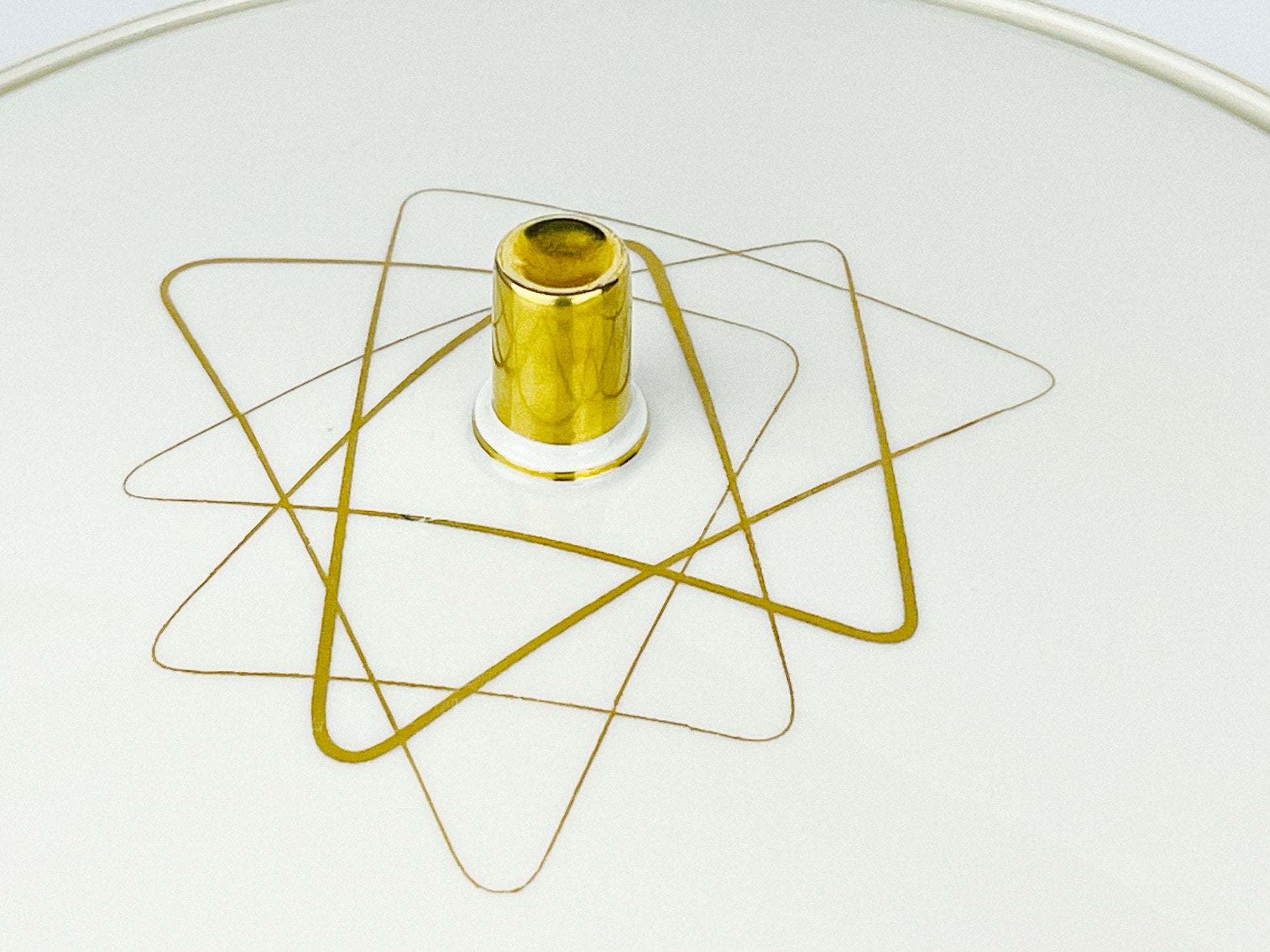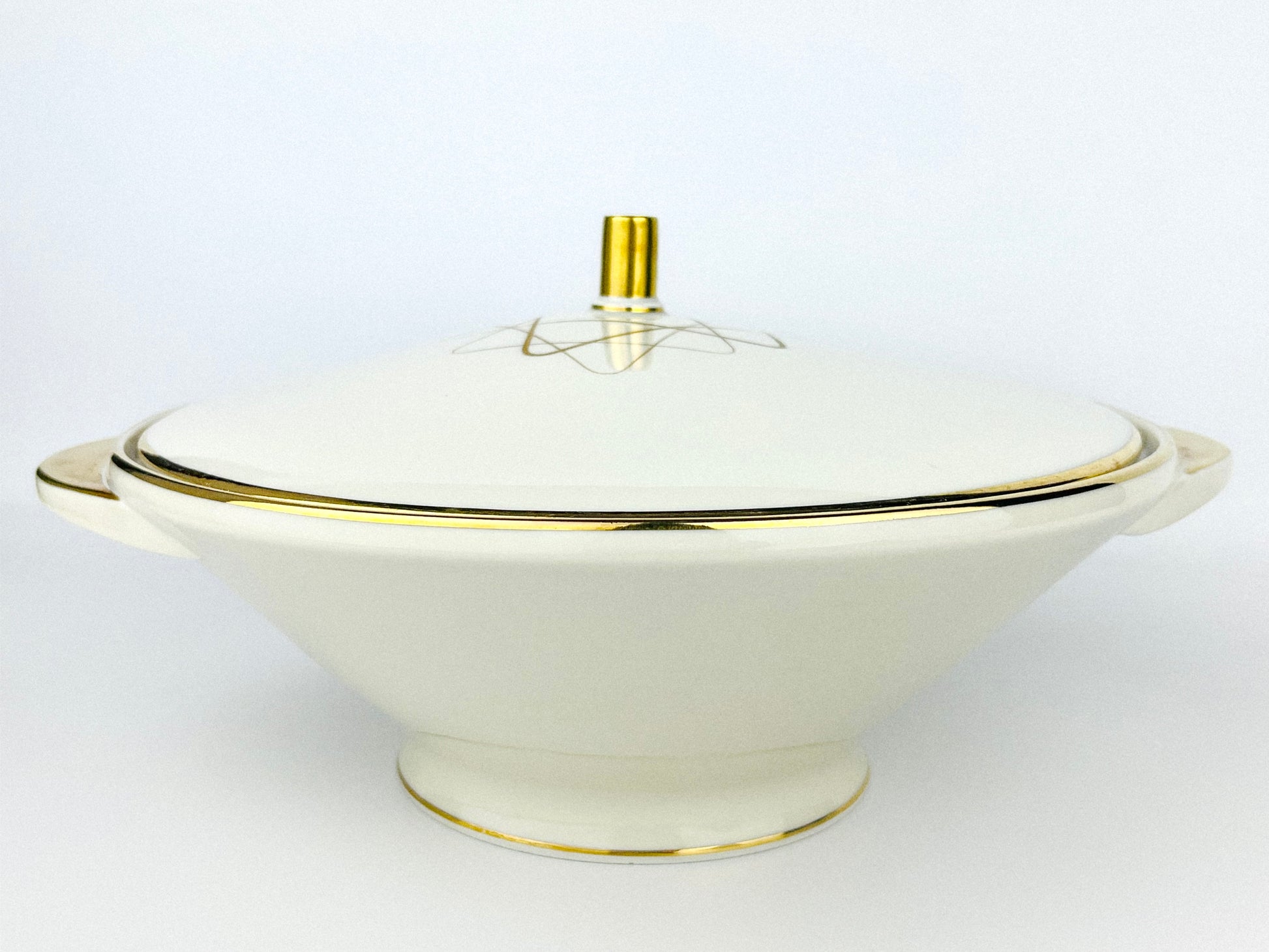 With a pristine colloidal gold, in spite of its age, and a rather modern equilateral triangle pattern, rounded on the 60 degrees angles, this translates some of the decades` trends, take Albert Einstein’s publication of the ‘On the Generalized Theory of Gravitation’ in 1950, or the space exploration starting with the 1957 USSR`s launch of the Sputnik, all wrapped up in the atomic age blanket. And as it has always been the case, what was happening at a macro level in the world was also translated into design and that into day-to-day objects inspiration, this tureen being a true embodiment of that.