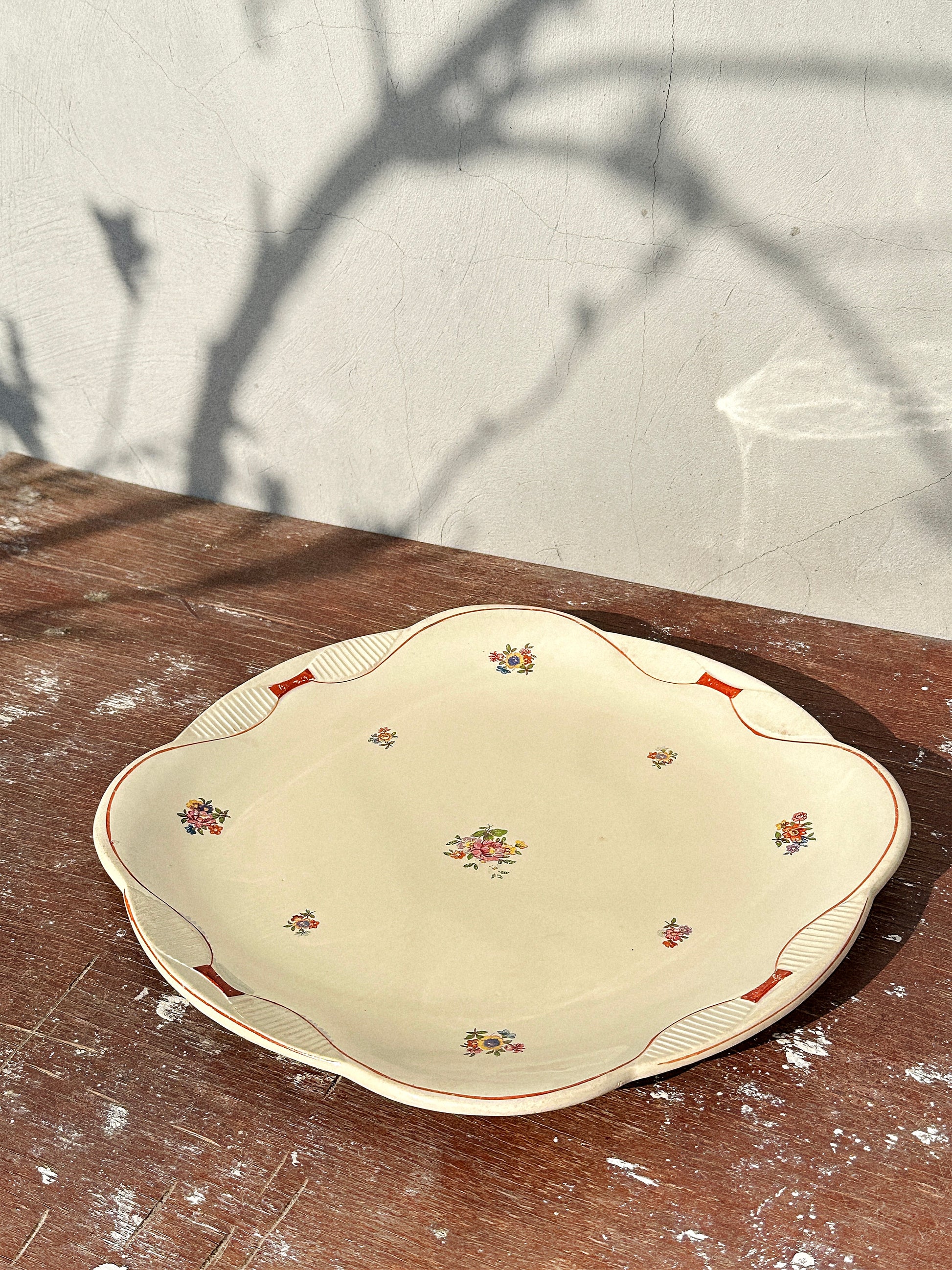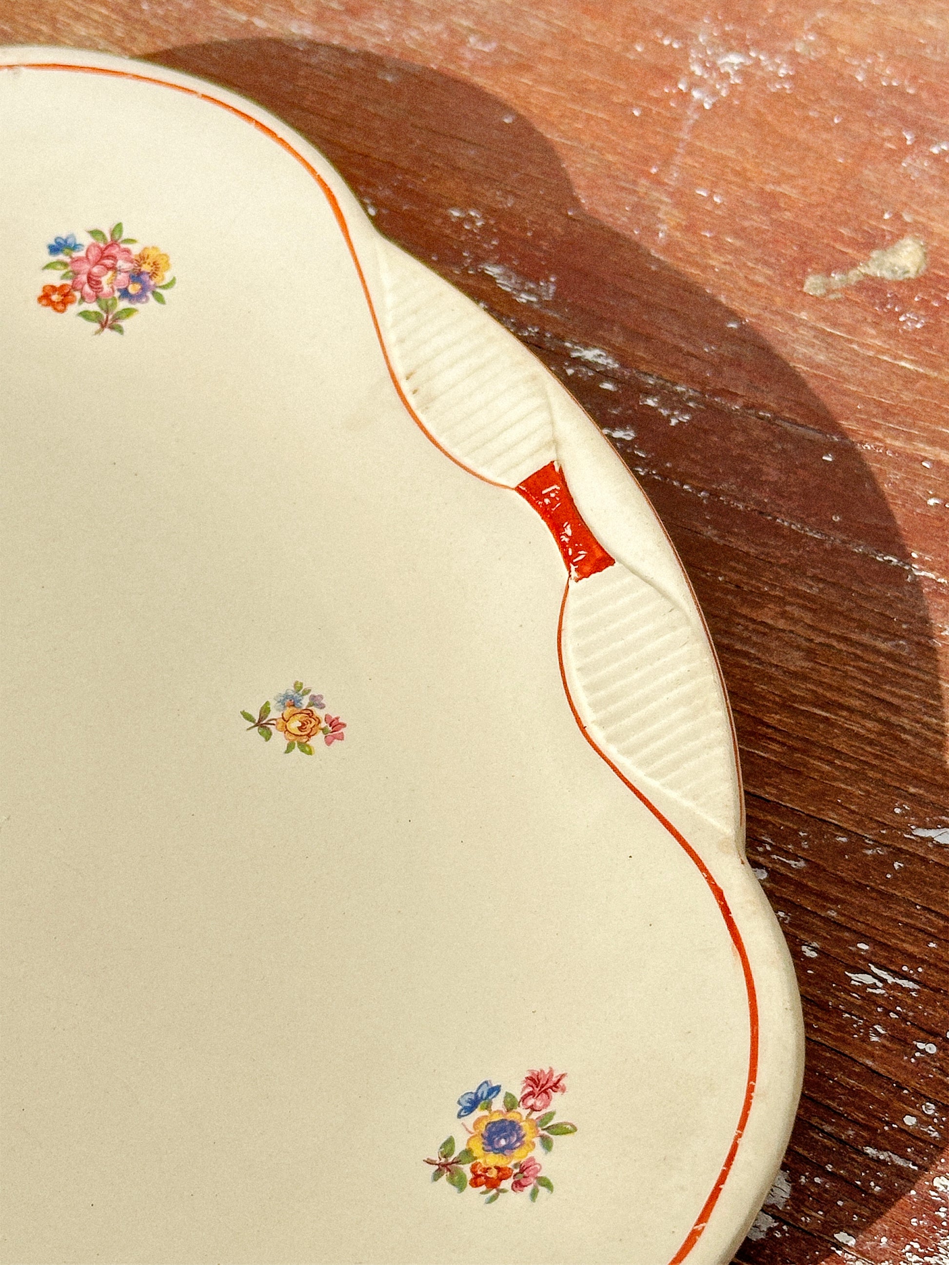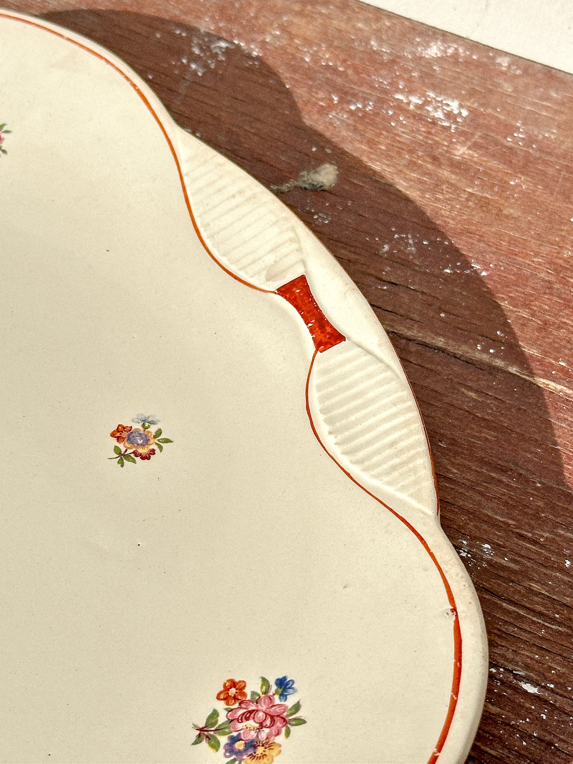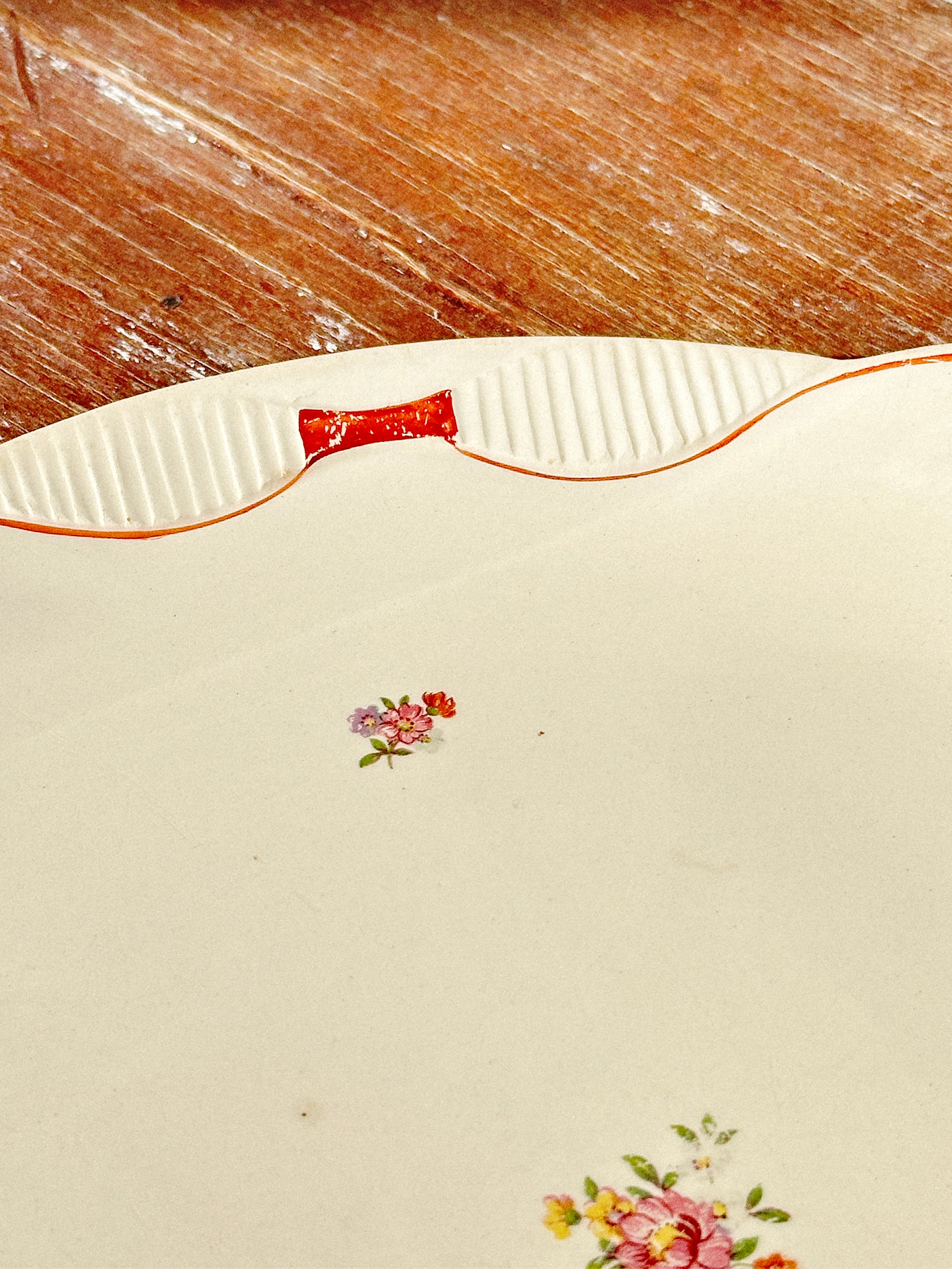 With a curled shape and an embossed linear pattern on the rim, almost looking like what would Art Deco will soon after this piece was produced would look like, differently sized wildflowers and a beautifully hand painted burgundy red flowing line on the margin, this piece “screams" French countryside.