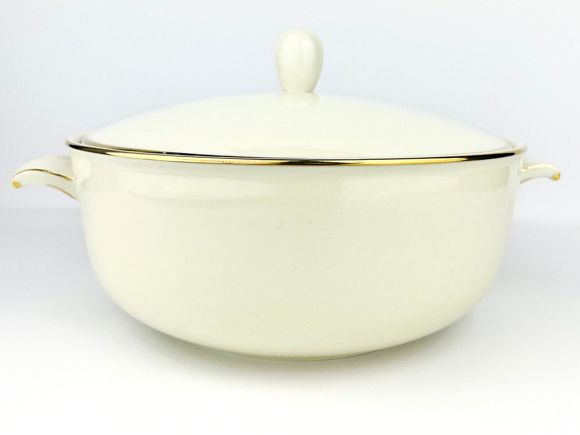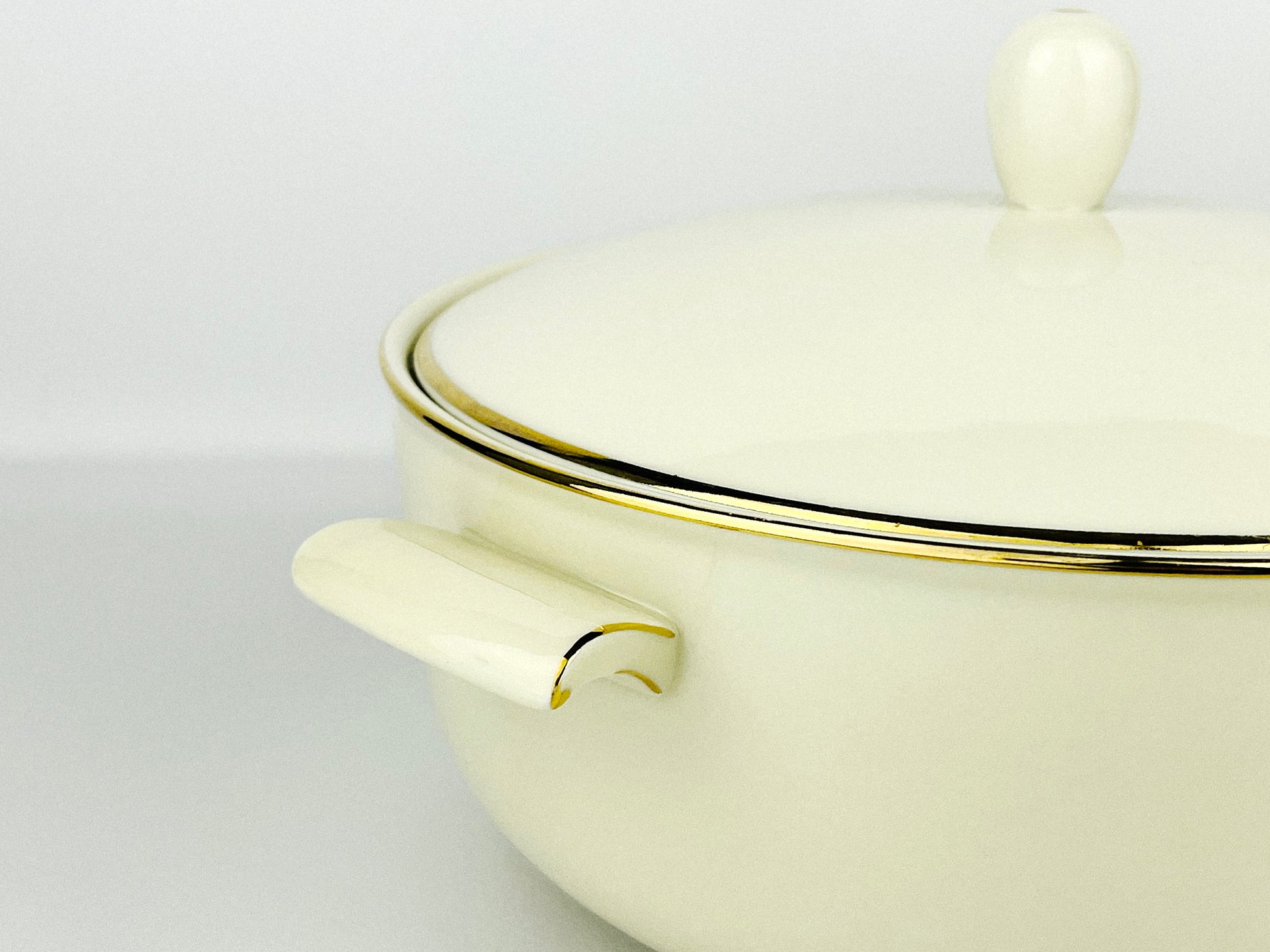Porcelain tureen produced by Schönwald in Germany (district of Wunsiedel, Bavaria), during early 1950s. Maintaining that classic style of creamy white porcelain with colloidal gold details on the rim of the bowl, the lid and handles, this is one of the rare pieces that still survived that period, especially since the company moved from Kahla to Schönwald, went through the division of Germany and all the economic turmoil that came with that and also reduced production considerably.