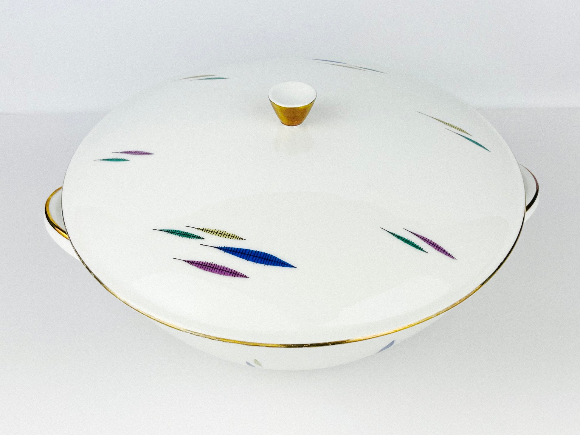 This piece is particularly interesting as it takes on a colour palette very much in tune with the upcoming trends of the 1950s and the almost deconstructed/abstract leaf pattern gives that modern mid-century touch while still reminiscing the elegance of the 1940s, featuring a colloidal gold motif on the rim of the lid and the handles (kindly check the pictures as the gold has slightly faded on some parts due to use and age).