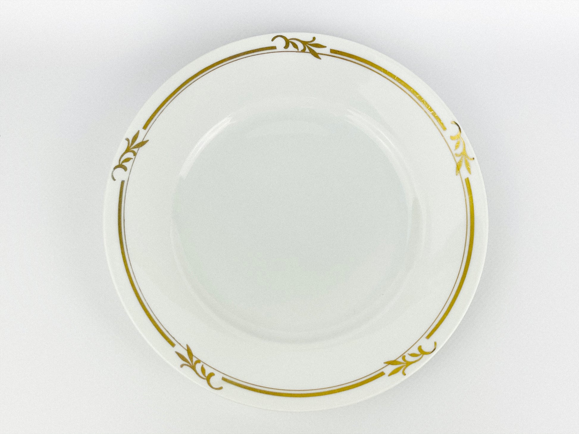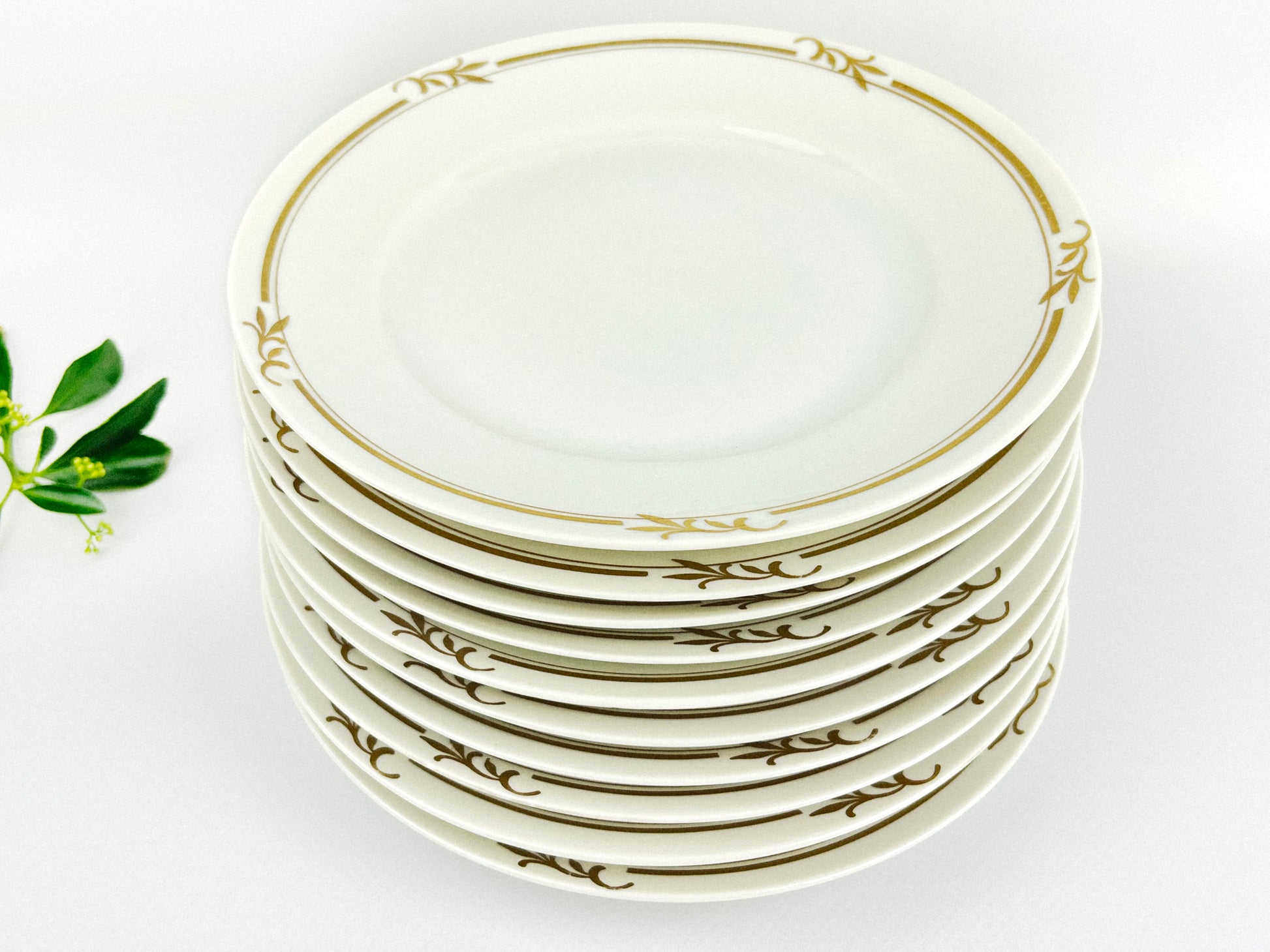 Set of 10 Eschenbach Bavaria white porcelain starter/dessert plates with a laurel leaf colloidal gold pattern on the rim, produced at the beginning of the 1940s. The pattern and the use of golden details is something very specific to that period, especially in the case of high-end porcelain pieces that maintained a more traditional style.