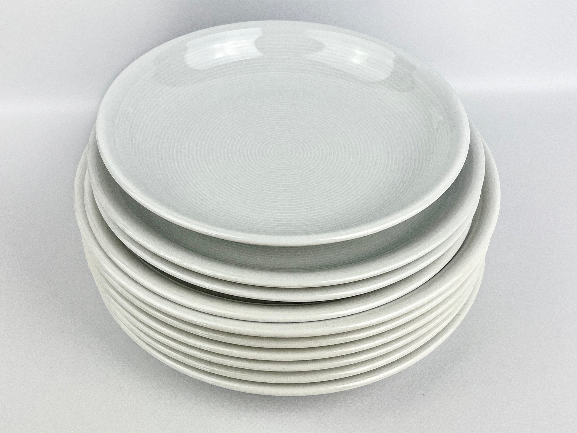 Set of 10 porcelain plates by Thomas (Rosenthal Group) from the 1980s, with an circular pattern resembling the Op Art designs from the 1960s, but much more minimalistic. As these were produced during 1980s mean they are dishwasher and microwave safe, being made out of a thicker and rather heavy porcelain, great for any modern kitchen.