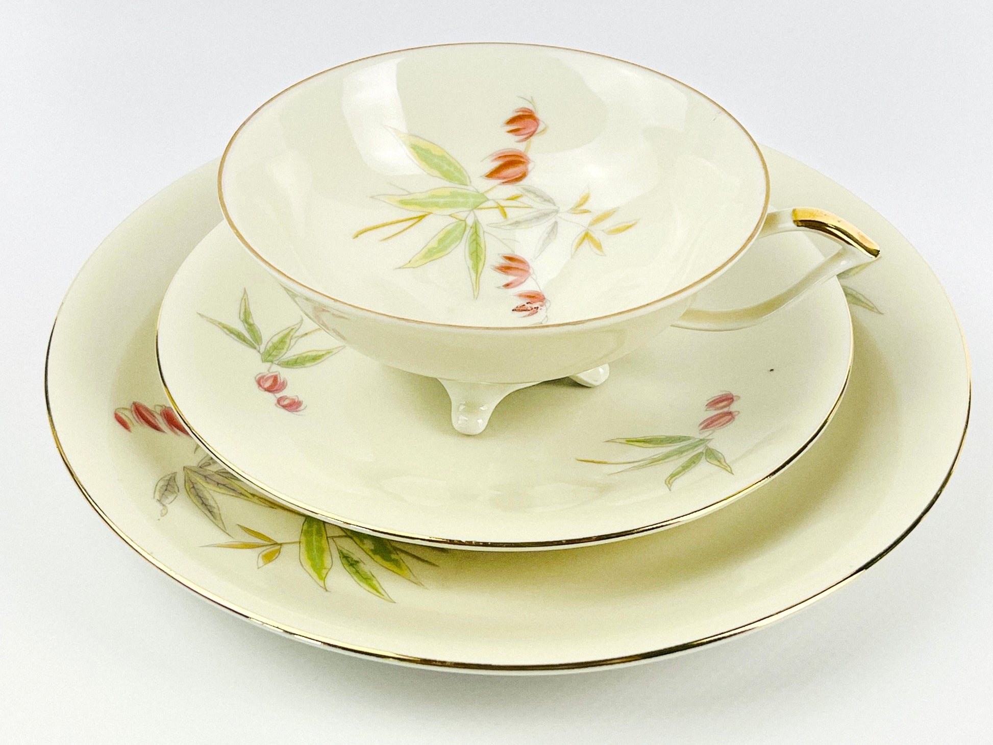This is an important note as this gives an extremely short timeframe for this set to be produced, the design of the teacup (pointed handle and raised feet) and the Asian themed floral pattern (bamboo flowers and leaves) being inspired from the eclectic style of the 1940s, including the colloidal gold details on the rim, and the influence of Chinese art throughout Europe during that period.